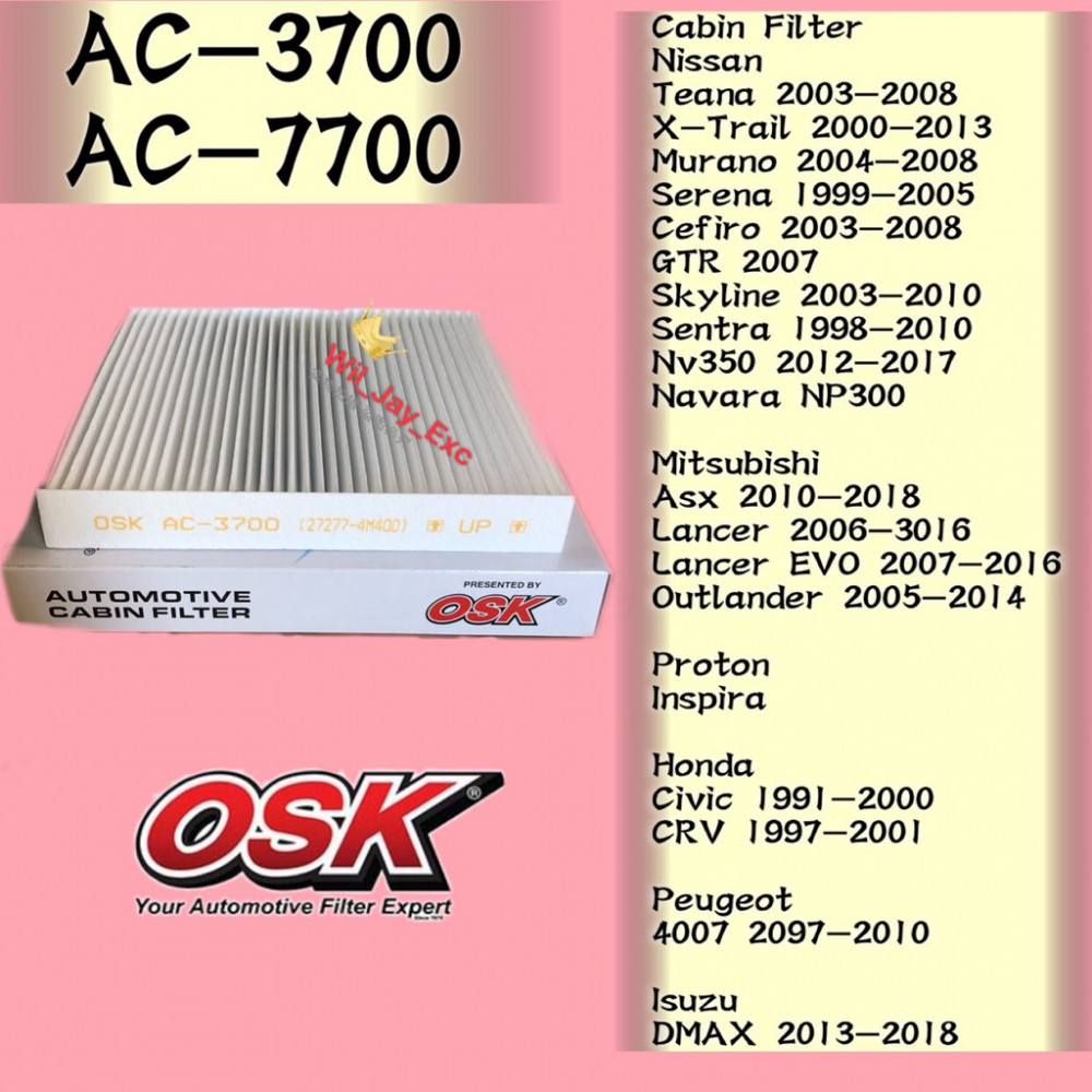 OSK CABIN FILTER 3700 NAVARA NP300,TEANA,X-TRAIL,MURANO,SERENA,CEFIRO,ASX,LANCER,EVO,INSPIRA,OUTLANDER,